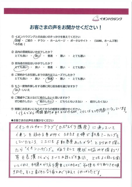 たまたま夫婦で新居ミーティングをしていたところ、ここにも不動産あったかな?とひらめき探したら”イオンハウジング”がありまして、現状の悩み、探すコツ等を長濱さんから聞いてお話しできました。